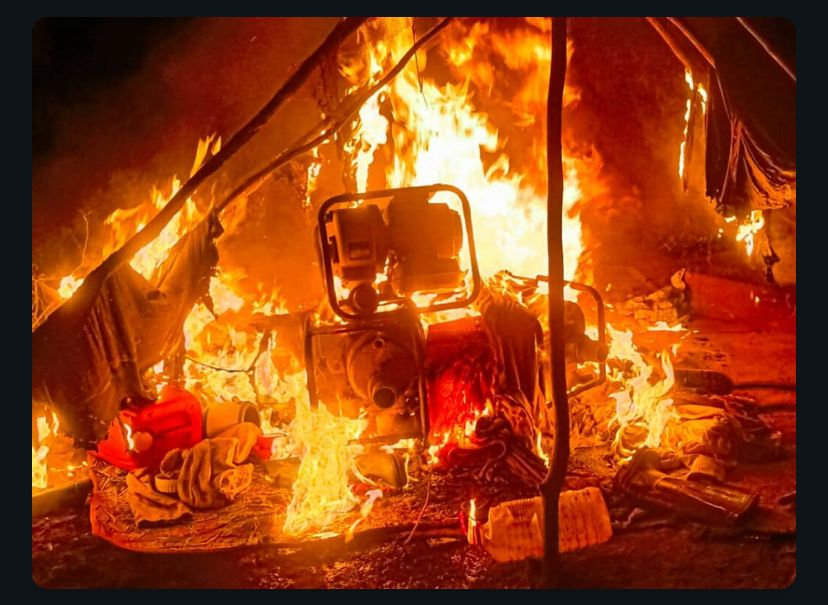 “These camps were operating deep within the forest reserve, destroying valuable forest land and threatening the integrity of our ecosystem,” Mr Frimpong said. “All four camps were destroyed during the operation, and equipment such as changfang machines, shovels, and other mining tools were seized and set ablaze to prevent further illegal activities.”
