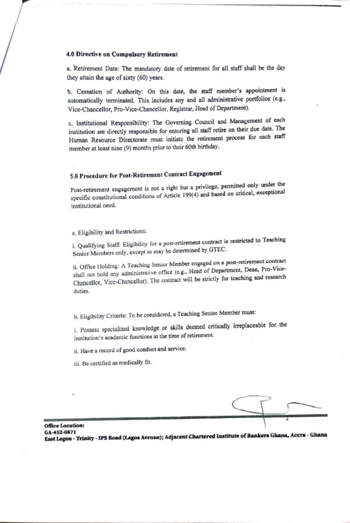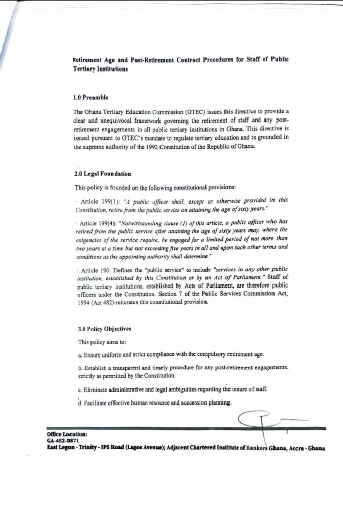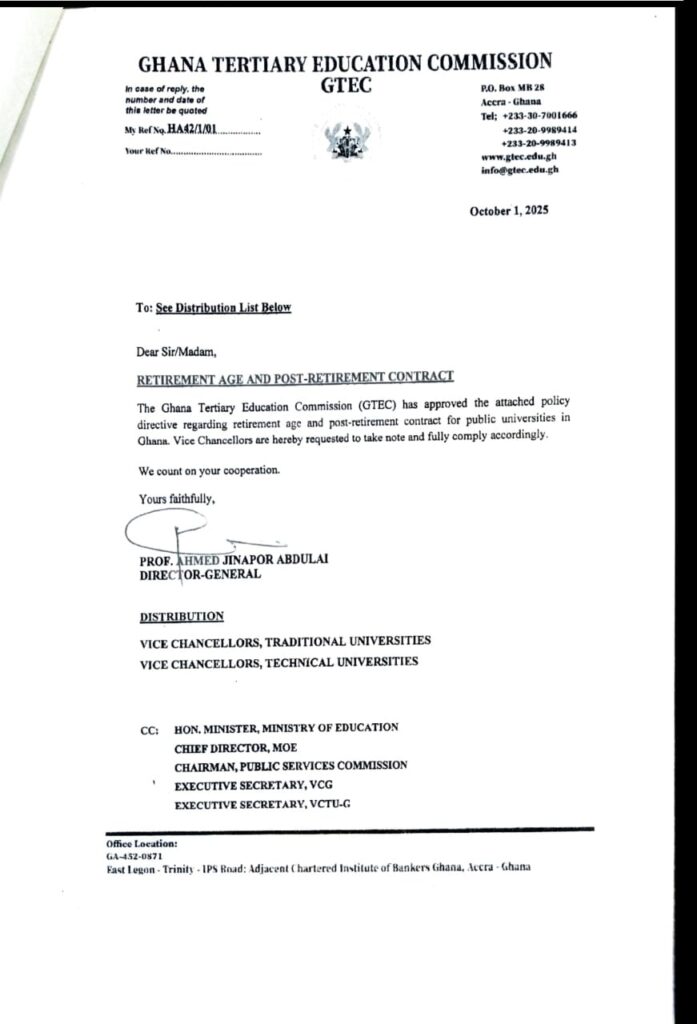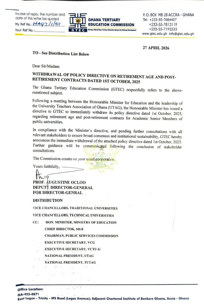 The Ghana Tertiary Education Commission (GTEC) has withdrawn its policy directive on retirement age and post-retirement contracts for senior academic members in public universities.