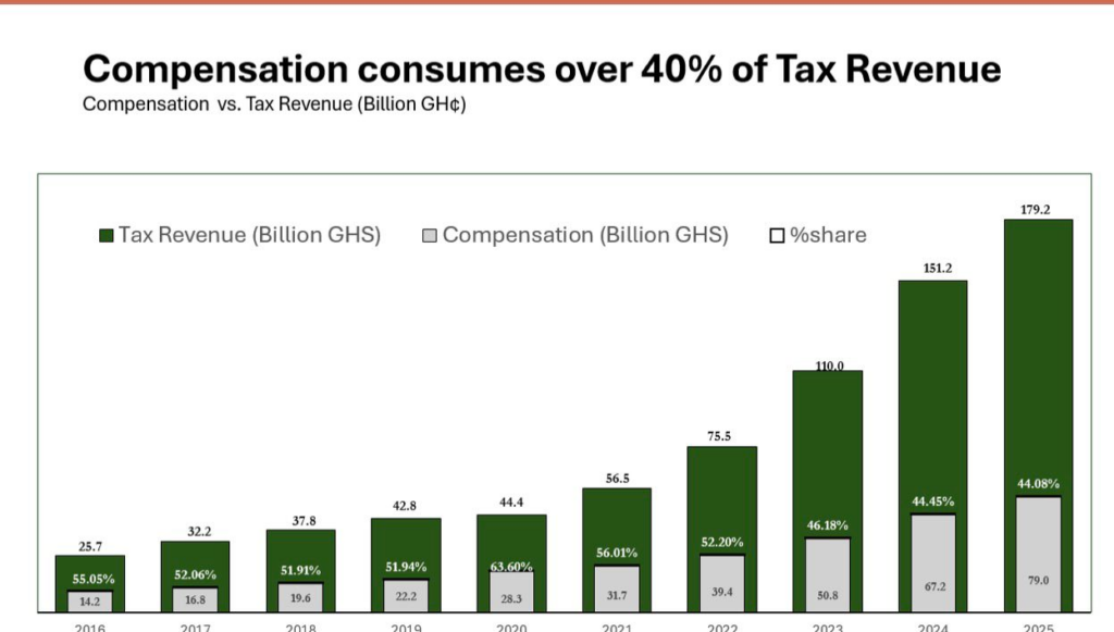 After meeting statutory obligations such as DACF, GETFund, NHIL, and servicing debt, only GH¢61.9 billion remained out of total tax revenue of GH¢183 billion. However, the public sector wage bill alone was GH¢78.9 billion.