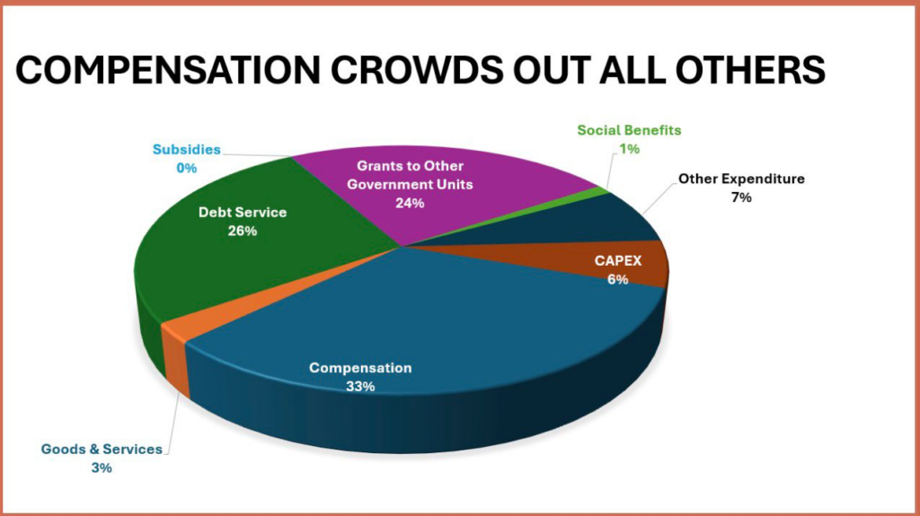 In this situation, there is simply no fiscal space to recruit more workers or adequately fund essential projects like schools, hospitals, and roads.