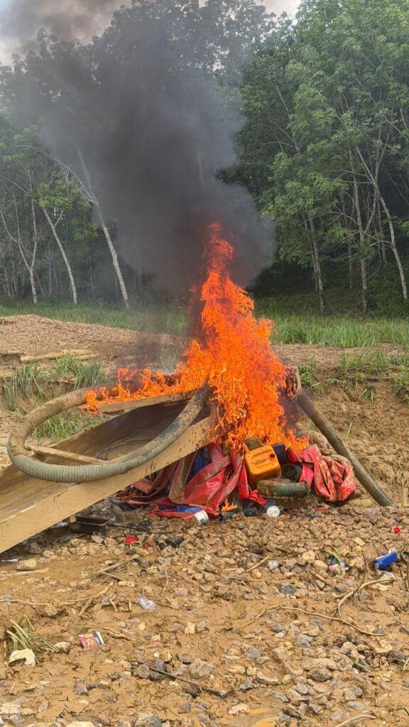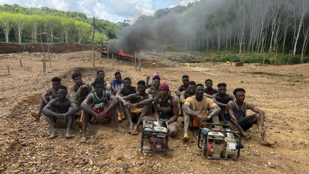 Authorities say the suspects were caught in the act of extracting gold, with their operations already causing extensive environmental damage, including the destruction of portions of palm plantations cleared for mining pits and equipment installation.